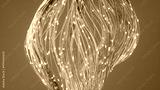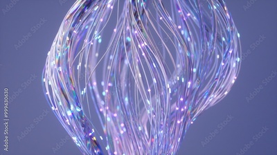 Vibrant fiber optic cables forming an organic, abstract shape in a 3d rendering, highlighting intricate details and vivid colors of the glowing light