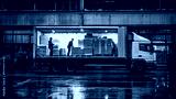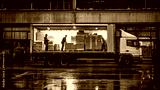 A truck is being loaded with boxes in a warehouse during rainy weather.