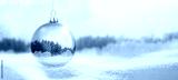 Weihnachtskugel aus Glas vor verschneiter Landschaft im Hintergrund