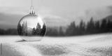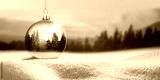 Weihnachtskugel aus Glas vor verschneiter Landschaft im Hintergrund